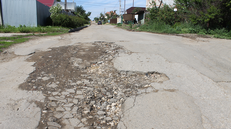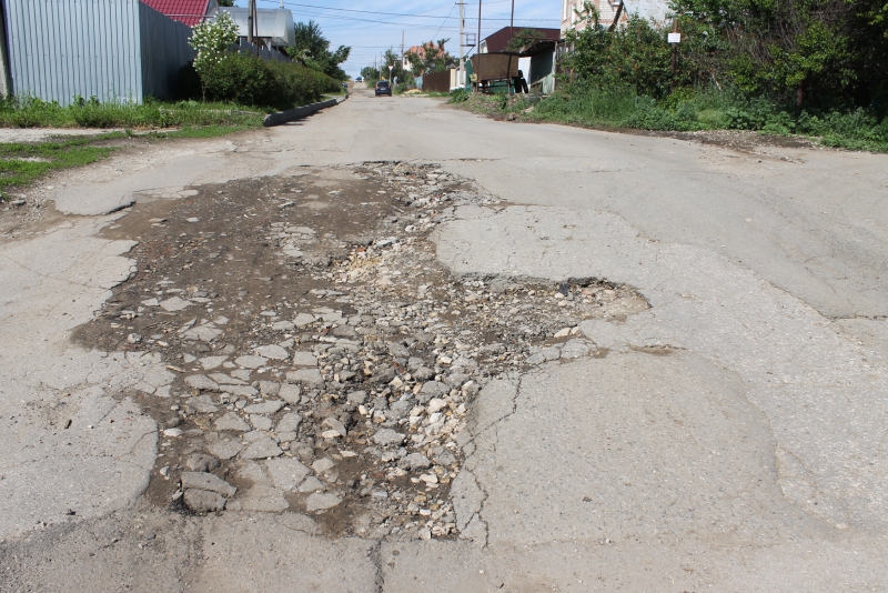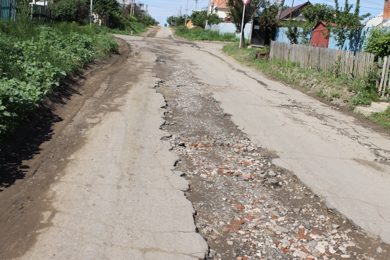 В апреле мы писали о том, что жителям этого поселка в Волжском районе Саратова приходится пробираться к своим домам по полностью разбитым дорогам, в том числе и по улице Актюбинской, по которой проходит маршрут школьного автобуса. За прошедшее время многие глубокие ямы устранили, но только на протяжении одного квартала от улицы Прудовой до Камчатской, а уже на пересечении с улицей Якутской водителям приходится преодолевать глубокие ямы. От улицы Якутской до Тагильской — центральной дороги поселка — дорожное покрытие улицы Актюбинской разделяет глубокая и широкая выбоина.