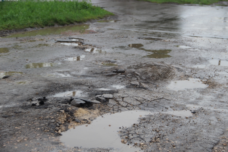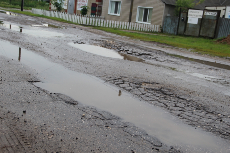Сильный ливень застал инспекторов «Дорожного контроля» на подъезде к поселку, превратив его улицы в сплошное скопление луж, местами полностью захватывающими проезжую часть. Обочина вдоль центральных улиц, по которой предпочитают ездить местные жители, превратилась в грязевое месиво. Но даже сквозь толщу воды во многих местах над покрытием дороги проступали выпоры асфальта.