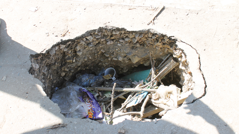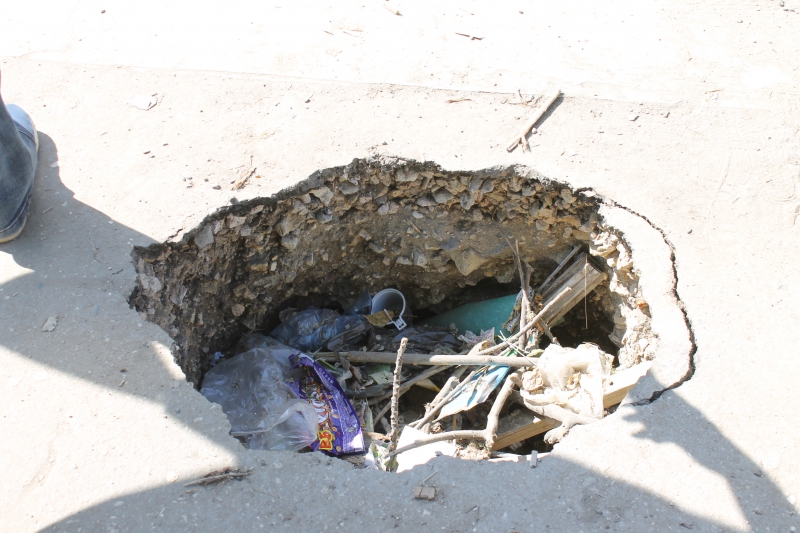 Ничем не обозначенное препятствие стало импровизированной мусоркой. Но яма все еще достаточно глубока, чтобы стать причиной серьезных травм для пешеходов, которые легко могут угодить в нее в темное время суток.