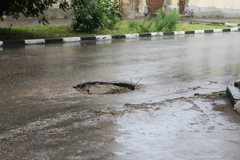 «Дорожный контроль» месяц назад обратил внимание на закиданный ветками провал на улице Вознесенской у гимназии №4. После нашей публикации, единственным изменением стало появление водоналивного блока, обозначившего опасное препятствие. Позже и его убрали, присыпав яму землей, не устранив причину разрушения дорожного покрытия.