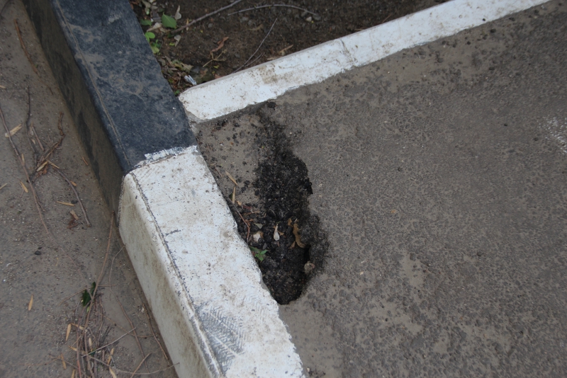 Никаких изменений не произошло и на тротуаре за домом 22/30 по улице Барнаульской, отремонтированном также в прошлом году. И хотя уплотнение на пешеходной дорожке оказалось достаточным, бордюр, обрамляющий ее, отклонился под разными углами. Одна из полимерных крышек люков смотровых колодцев, не простояв года, начала разбиваться. Находящаяся тут же за домом асфальтированная площадка также не изменилась, ее покрытие продолжает разрушаться, и плотность его замерить не удалось, так как прибор моментально фиксировал отсутствие уплотнения. На пересечении Барнаульской и Пензенской раскуроченный в ходе уборочных работ борт также никто не спешит восстановить.
