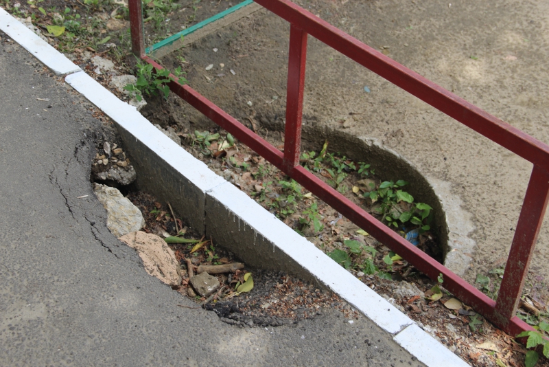 Пока многочисленные дефекты игнорируются, одна из просадок на тротуаре между домами №25 и 21 превратилась в небольшой провал. Учитывая, что тротуар с травмоопасным участком ведет к детской площадке, совершенно непонятно, почему он до сих пор не приведен в нормальное состояние. Содержание самой детской площадки также вызвало недоумение: под качелями расположилась яма с водой с торчащим из нее строительным мусором.