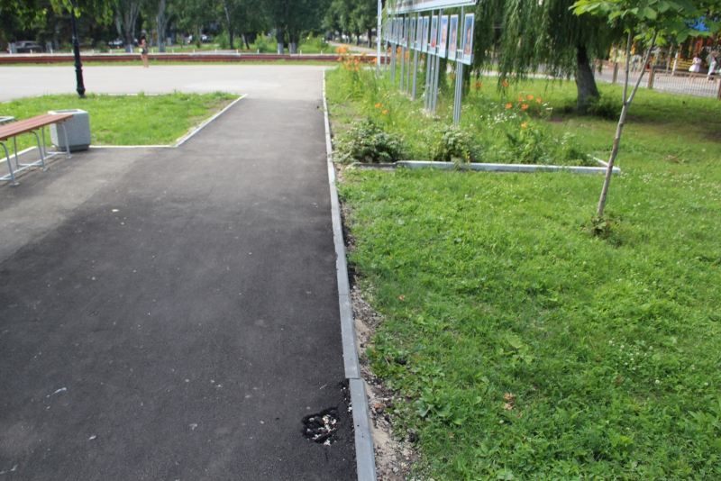 В сквере на 50 лет Октября продолжает вышелушиваться асфальт вокруг лавочек, особенно это заметно на самом оживленном участке пешеходной зоны от Алексеевской до Рябиновской. Однако наибольшее возмущение вызывает место брошенных строительных работ. Речь идет об обустройстве подхода от сквера к остановке «Стрелка». Он до сих пор находится в том же виде, что и год назад. Выставлен бордюр, насыпан щебень, только вот асфальтом его покрыть забыли. Так и стоит в этом в целом ухоженном сквере заброшенный уголок, ярко характеризующий отношение ответственных лиц к вопросам благоустройства.