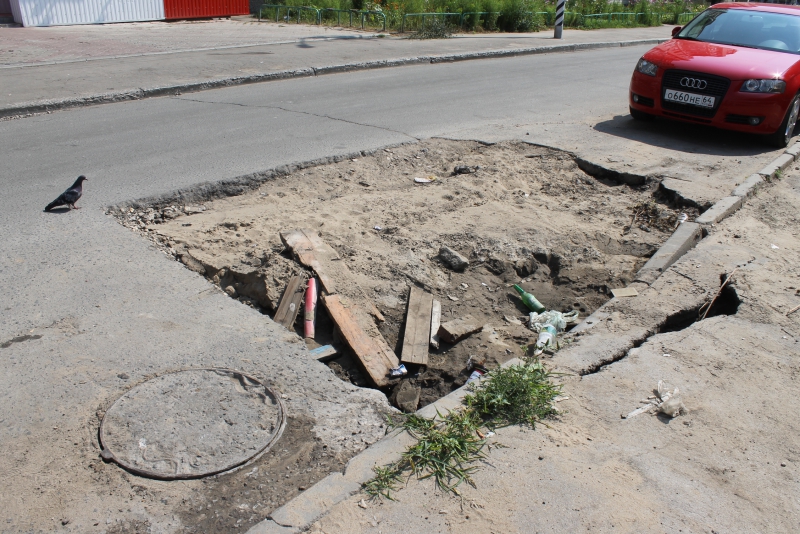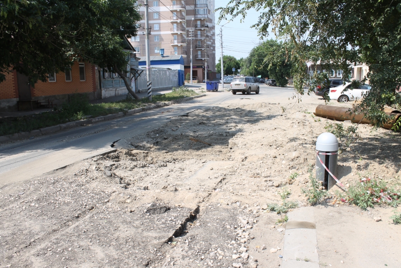 Брошеный раскоп, засыпанный песком и мусором, находится на отрезке от Некрасова до Соборной. Он перекрывает собой половину проезжей части, и, судя по расходящимся трещинам на асфальте, постепенно расширяется в направлении тротуара. Местные жители отметили опасное место автомобильной покрышкой и пластиковыми ведёрками.