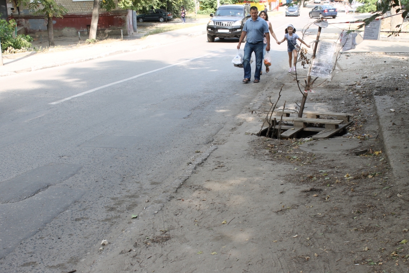 Крышка люка, возвышающаяся над поверхностью дороги более, чем на два нормативных сантиметра, находится в нескольких метрах от перекрестка Саперной с малой дорогой проспекта 50 лет октября. Два дождеприемника, расположенных друг напротив друга, по обе стороны проезжей части напротив дома №7, утоплены гораздо сильнее, чем требуется для нормального водоотведения. Автомобилисту, попавшему колесом в образованную подобной ливневкой глубокую яму, грозят непредвиденные траты на ремонт ходовой или услуги шиномонтажа.