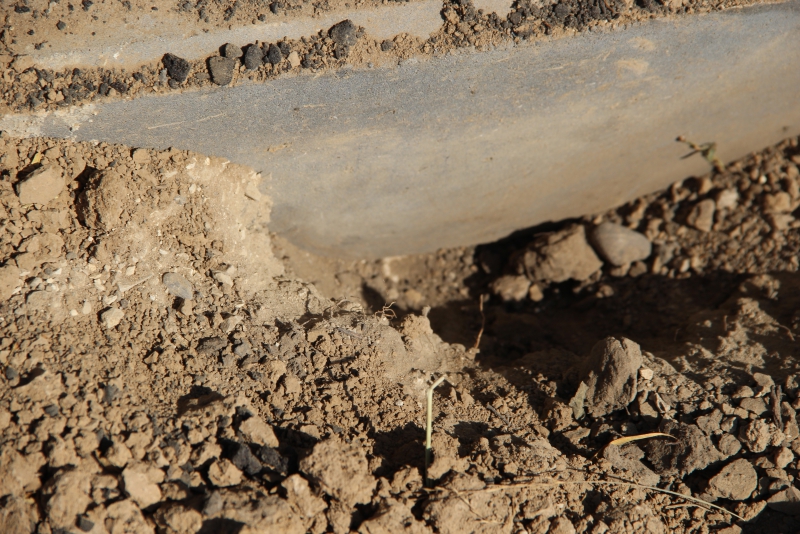 Бортовой камень на всем протяжении пешеходной дорожки «гуляет» из стороны в сторону, повсеместно наблюдаются ненормативыные уступы. Причина этого оказалась достаточно прозаичной. При помощи подручных средств удалось докопаться до самого основания борта, который, как выяснилось, был просто установлен на землю и присыпан по краям грунтом. Никаких следов бетона или плотного основания, на который должен устанавливаться бортовой камень, найти не удалось.