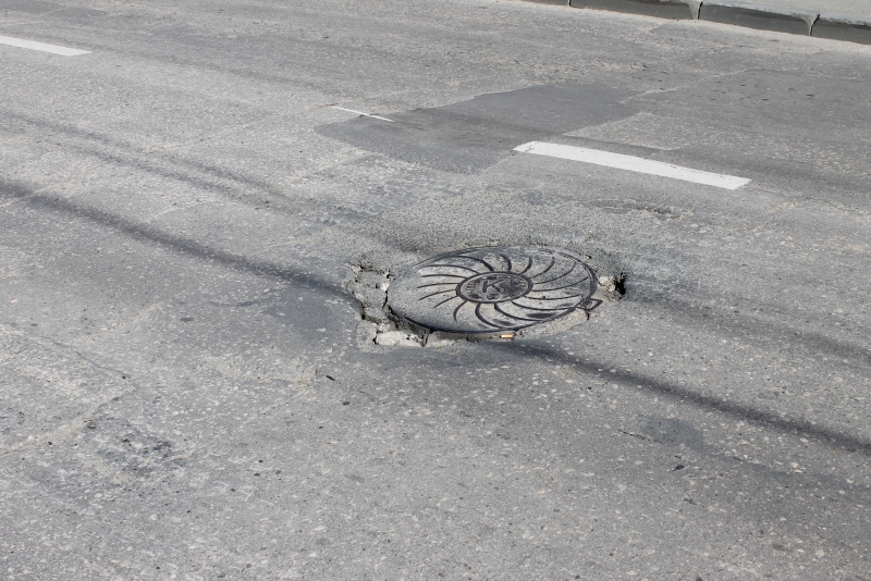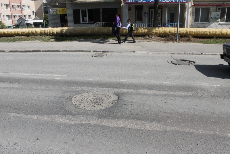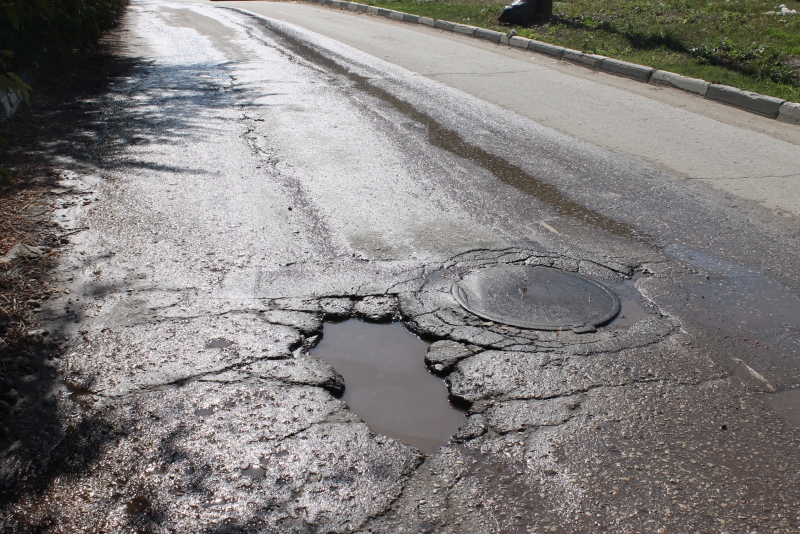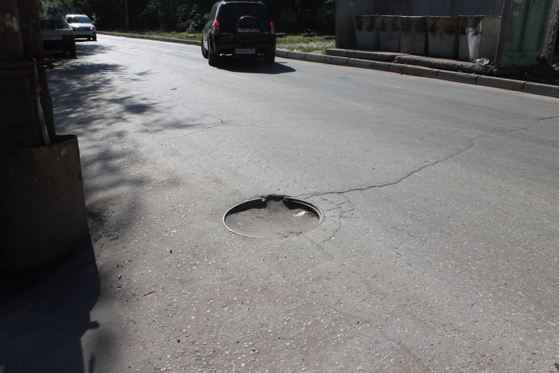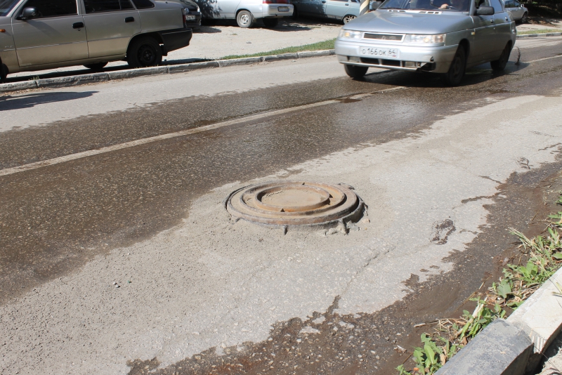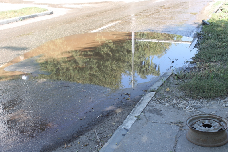 На этом же участке дороги рядом со смотровым колодцем находится глубокая выбоина, заполненная водой. Водители, своевременно не заметившие её, рискуют повредить колёса своих автомобилей.