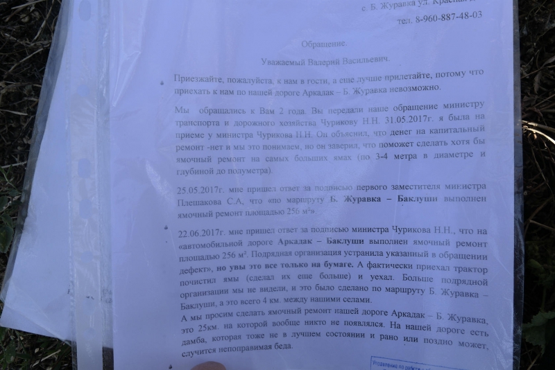 В июне местные жители били тревогу и обращались в министерство транспорта по поводу состояния проезжей части. На это они получили ответ, что на участке от Большой Журавки до Баклуш был проведен ямочный ремонт площадью 256 квадратных метров. Никакого ремонта сельчане в глаза не видели. Ими был замечен только трактор, который вычищал ямы.