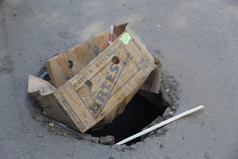 В своем обращении в редакцию жители дома №18 также жаловались на смотровой колодец, который из-за разрушенной крышки находился в полуоткрытом состоянии. Администрация Кировского района сообщила, что и эта проблема устранена, и крышка люка смотрового колодца закрыта. Но, как убедился сотрудник «Дорожный контроля», старую крышку, действительно, убрали, а вот смотровой колодец прикрыт лишь картонной коробкой.