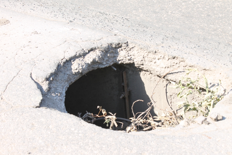 Глубокая яма, примерно в полметра диаметром, появившаяся, по всей видимости, в результате обрушения смотрового колодца, находится посередине проезжей части недалеко от пересечения Огородной и Просяной. Водителям приходится быть предельно осторожными на данном участке, так как препятствие никак не обозначено.