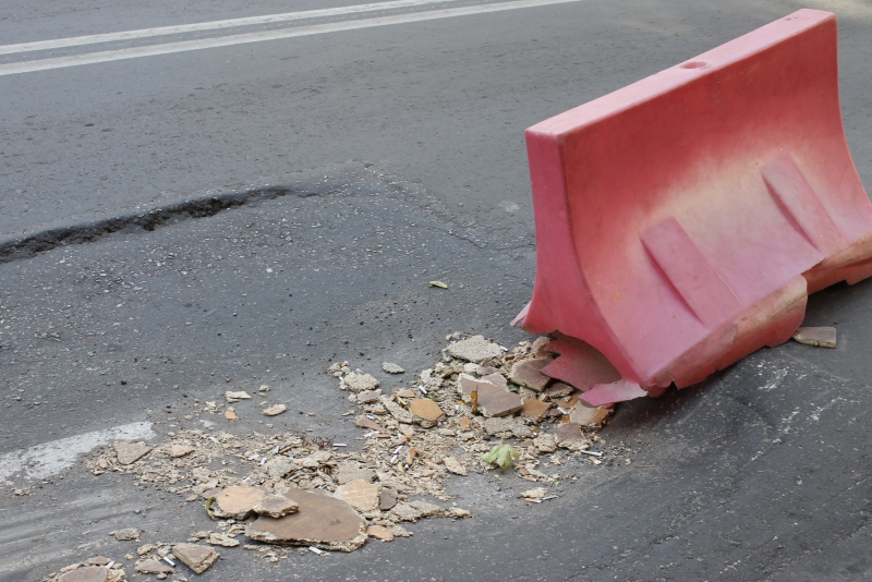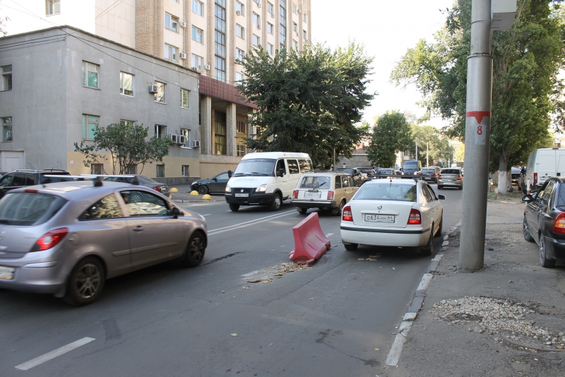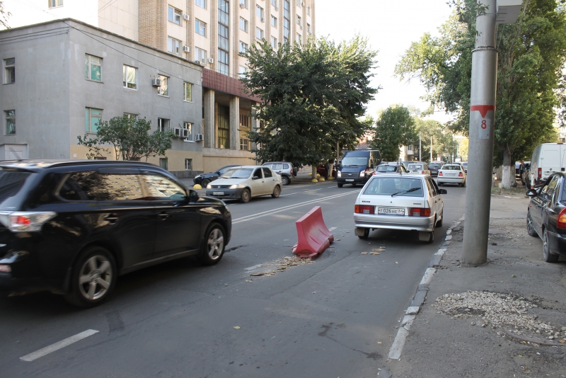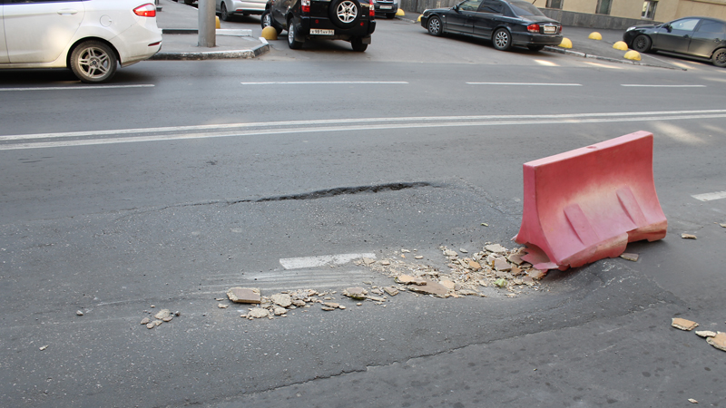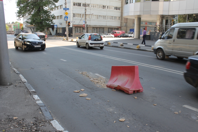 Опасный провал обозначен водоналивным блоком, расположившимся между двумя полосами движения по направлению к улице Степана Разина. Автомобили вынуждены объезжать возникшее препятствие слева, выезжая на полосу встречного движения, либо справа, со свистом притираясь шинами к бортовому камню.
