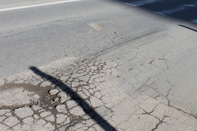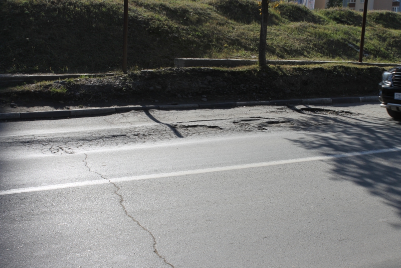Проблемный участок находится перед ведущим к школе пешеходным переходом, не оборудованным светофором. Дорожное покрытие в правом ряду здесь сильно растрескалось, образовавшиеся выбоины соседствуют с глубокой просадкой асфальта.