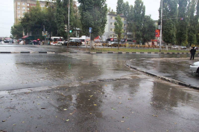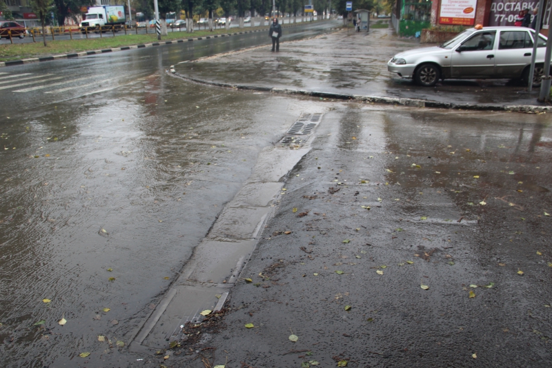 Крупный дождеприемник во всю ширину проезжей части на пересечении улиц Осенней с проспектом Строителей выполняет свою функцию хорошо если на треть, из-за чего во время сильных ливней не может справиться с потоками воды, и они устремляются на одну из основных транспортных артерий Ленинского района — проспект Строителей.