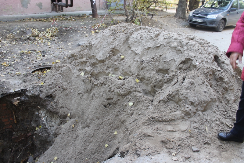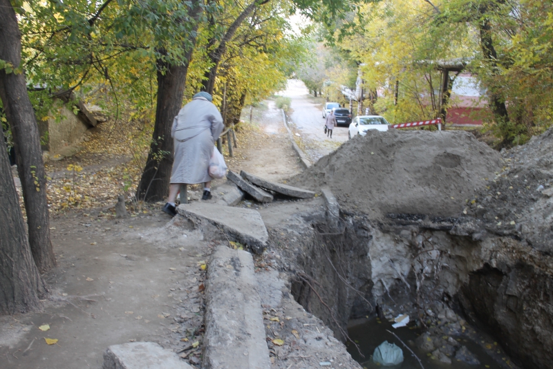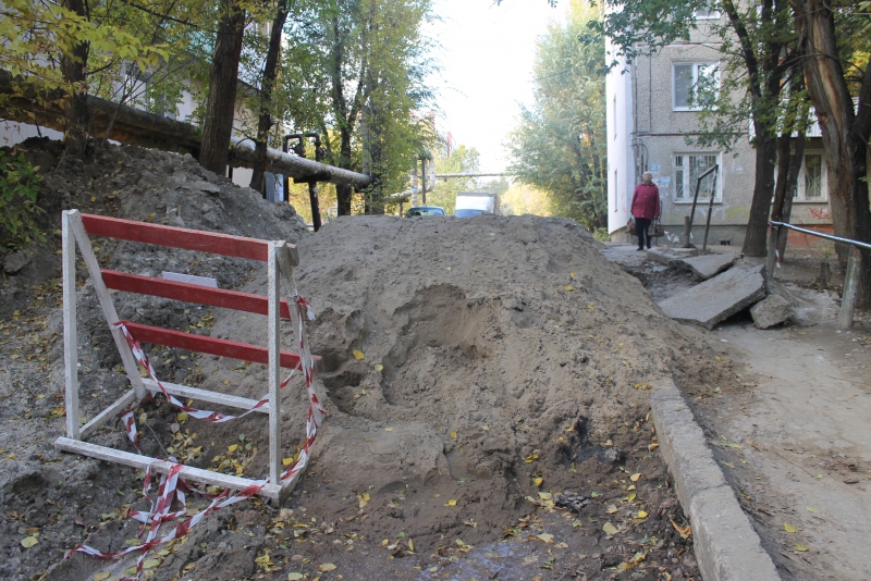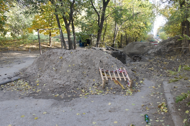 К слову, прохожие, вынужденные ходить этим маршрутом, рискуют больше всего. Предназначенный для них тротуар весь завален обломками бордюра и кусками асфальта. Сам раскоп со стороны тротуара совершенно не огорожен. Местные протоптали для себя тропинку через палисадник, которая в дождливую погоду превращается в болото, а случайно оказавшийся здесь человек может и вовсе не заметить ее, особенно вечером, на практически не освещаемой улице.