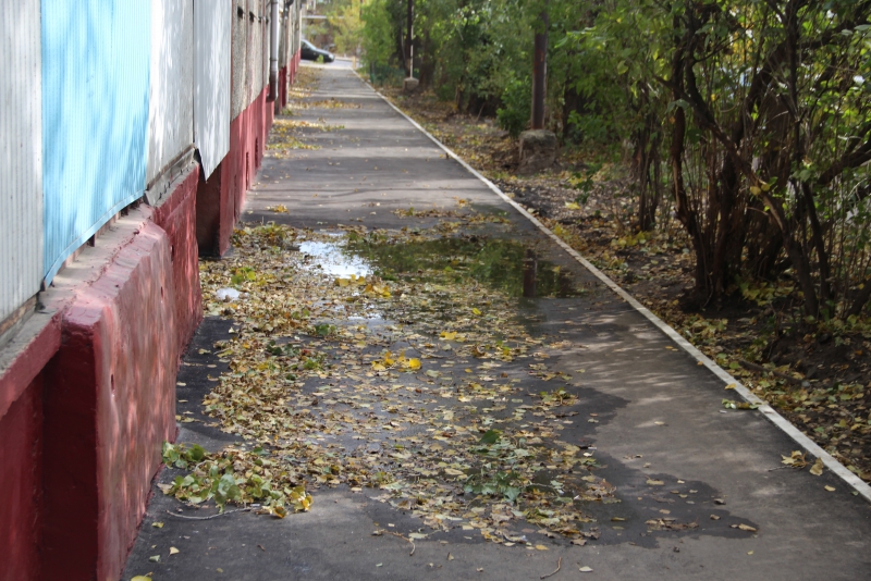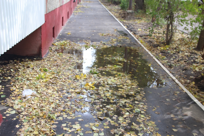 Во время инспекторской поездки по дворам Октябрьского района, кроме проблемных дворов на Вольской, визуальные нарушения обнаружились только у дома №8/18 по улице Клинической. На тротуаре позади дома, совмещенном с отмосткой, образовалась большая глубокая лужа, занявшая всю пешеходную зону. Кроме жителей самого дома этим тротуаром, идущим параллельно проезжей части улицы Клинической, пользуются жильцы соседних домов, а также воспитанники детского сада №54 и их родители.