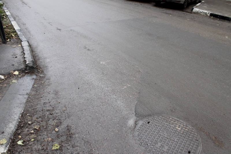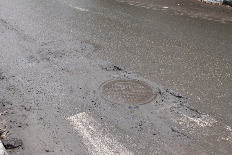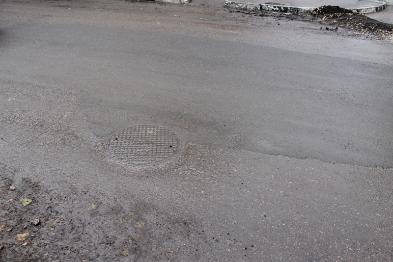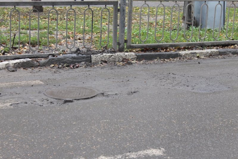 За время, прошедшее с момента нашей публикации, данный люк был отремонтирован - установлена новая горловина, крышка выровнена по поверхности дороги. А вот попытки заделать асфальтовой крошкой неровности покрытия, оставшиеся после вскрышных мероприятий, успехом не увенчались. Она очень быстро выбилась колёсами проезжающих автомобилей и водителям по-прежнему следует быть очень внимательными при переезде данного перекрёстка.