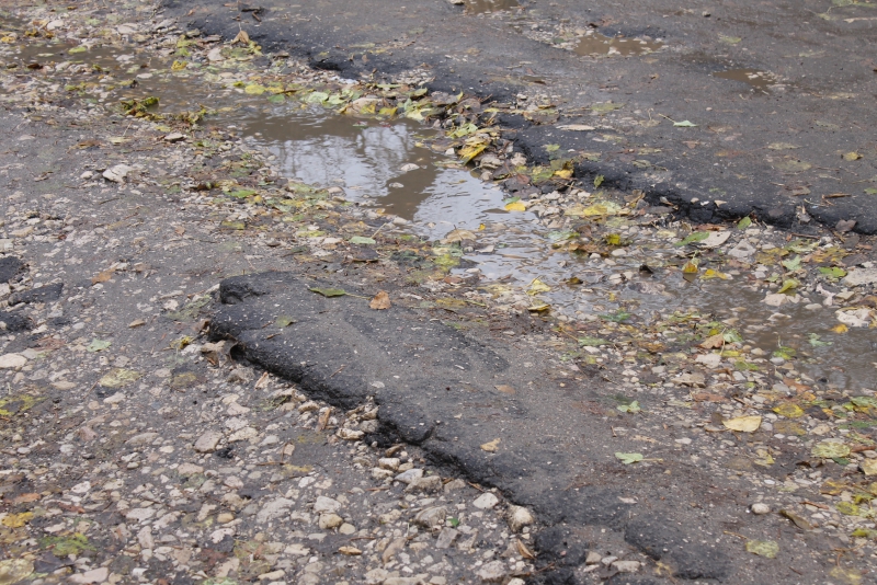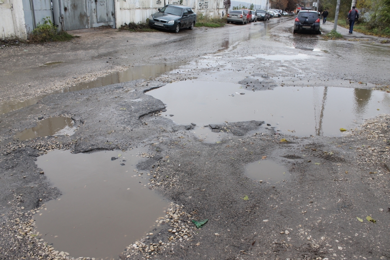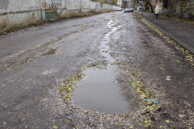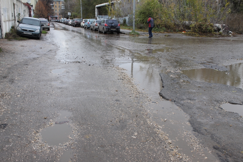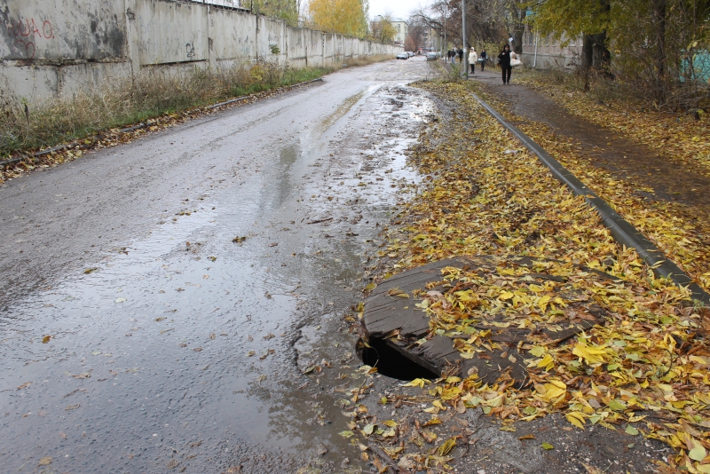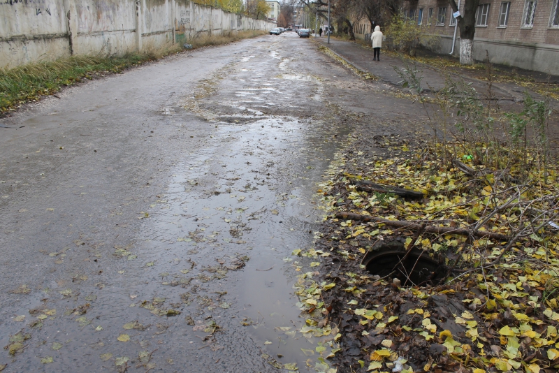 Нормальное асфальтовое покрытие дороги в Киевском проезде присутствует лишь на протяжении нескольких десятков метров, от перекрестка с улицей Орджоникидзе до дома № 1. Далее ситуация резко ухудшается - дорога превращается в одну огромную выбоину с выступающими островками оставшегося асфальта. И пока разбитое до щебня покрытие остро нуждается в ремонте, оказавшиеся на этой улице водители продолжают калечить подвески своих автомобилей. А завершают композицию два опасных смотровых колодца, расположенных на проезжей части, ближе к тротуару. Один из них слегка прикрыт обломанной деревянной крышкой, а второй зияет открытой горловиной, неприметный среди опавшей листвы.