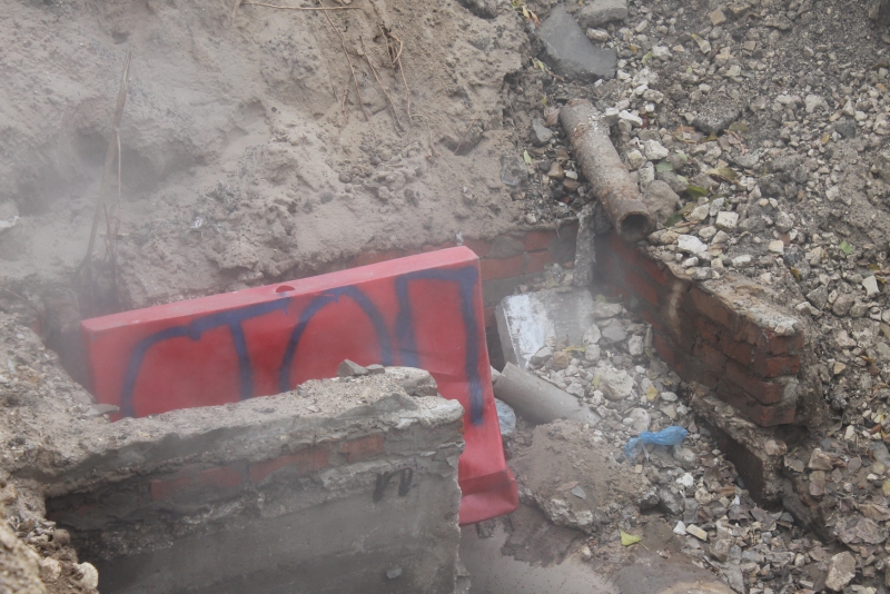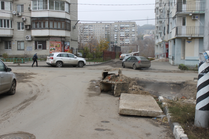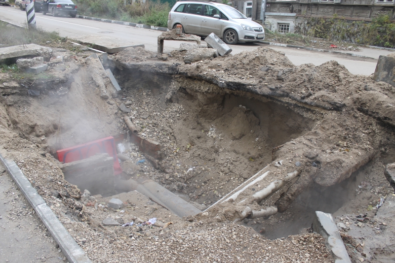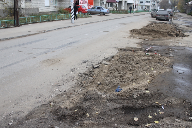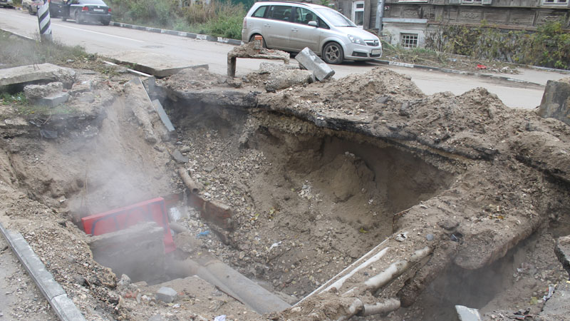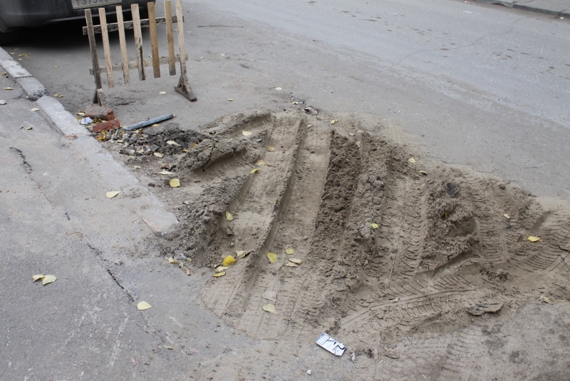 На протяжении всего одного квартала дорога по Кузнечной оказалась вскрыта в пяти местах. Сейчас эти котлованы засыпаны песком без восстановления твердого асфальтового покрытия. Предупреждающих ограждений вокруг них уже практически не осталось, и водители, попавшие на плохо освещаемую Кузнечную в темное время суток, рискуют основательно увязнуть в одной из этих ловушек.