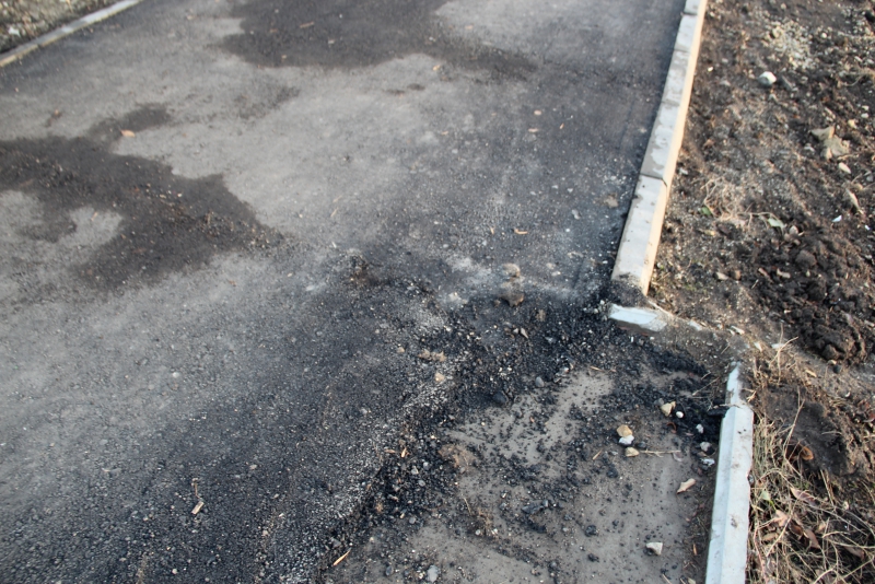 Ширина пешеходной зоны позволяла подрядчику использовать тяжелую строительную технику, которой, судя по всему и проводилась укатка асфальта. Качество уплотнения покрытия по центру тротуара не вызывает нареканий, в отличие от прилегающих к бордюру участков, которые зачастую выкрашиваются. Уплотнить смесь без использования катка в этих «капризных» местах у рабочих не получилось, из-за чего там в скором времени появятся первые выбоины. Также разрушения могут начаться на «промокших» участках покрытия, где вода ушла в асфальт. Без специальной экспертизы нельзя сказать, пройдет ли этот асфальт испытание по водонасыщению, но косвенные признаки свидетельствуют, что, скорее всего, испытания провалятся. Кстати, экспертизы никакой, судя по всему, и не было. Нами не было замечено ни одной вырубки асфальта. Впрочем, это не удивительно.