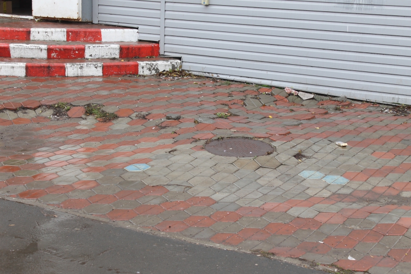 Другой вызывающий опасения горожан участок пешеходной зоны находится здесь же - за углом. Выложенный брусчаткой тротуар в этом месте буквально пошел волнами из-за сильного проседания покрытия, появившегося вокруг смотрового колодца, угрожающих превратиться в провал прямо под ногами прохожих.