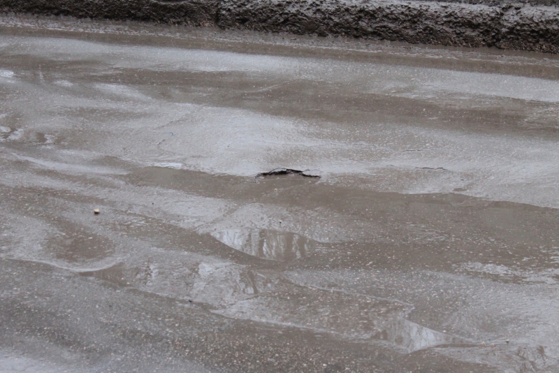Повреждение дорожного покрытия произошло в месте проводившихся ранее вскрышных работ напротив дома №1. Сейчас сильная просадка занимает крайний правый ряд при движении транспорта в сторону путепровода. По асфальту расходятся глубокие трещины, и образование сильного провала в подобной ситуации является лишь делом времени. Никаких предупреждающих знаков или специальных ограждений перед препятствием не выставлено, что делает его неприметным, особенно в темное время суток.