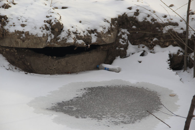 Препятствие расположилось на проезжей части малой дороги проспекта 50 лет Октября, перекрыв полосу движения от Стрелки в сторону 1-й Дачной. По направлению движения глубокую яму огораживает выкопанный грунт, с других сторон котлован, наполненный замерзшей водой, обозначили воткнутыми ветками, натянув между ними оградительную ленту.