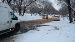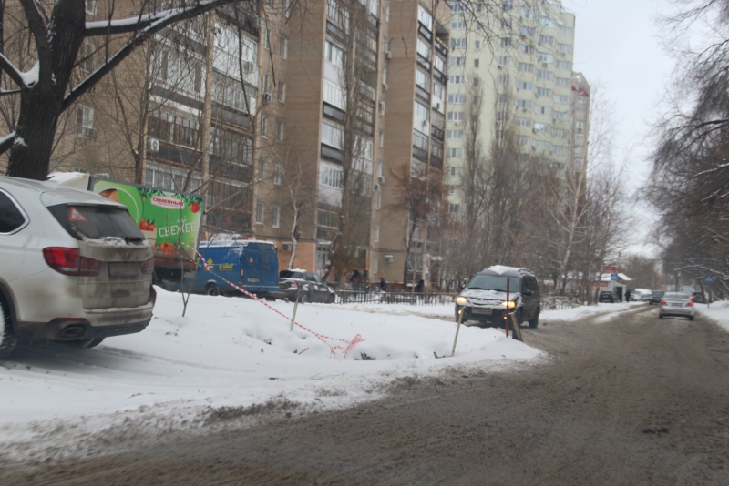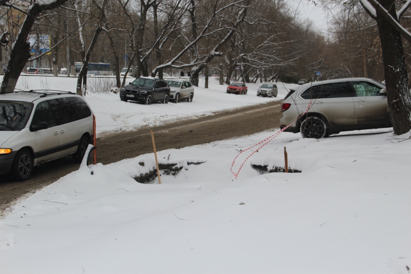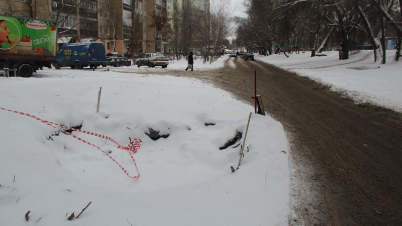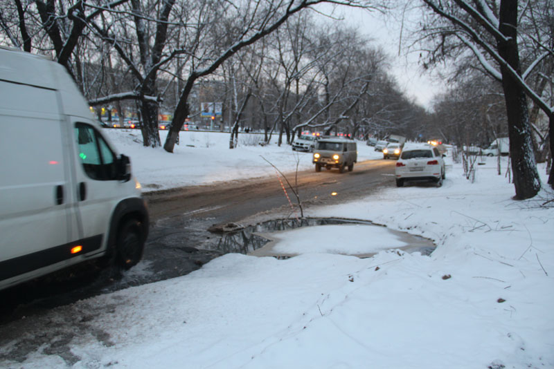 Раскоп занимает половину проезжей части, затрудняя по ней движение транспортных средств. В конце недели на открытых коммуникациях произошла авария, затопившая котлован и прилегающую дорогу. За прошедшее время течь была устранена, и даже убрана наледь с проезжей части, но котлован до сих пор несет угрозу автолюбителям. Единственным обозначением глубокой ямы служат воткнутые по ее периметру ветки, которые в темное время суток не так уж и легко заметить.