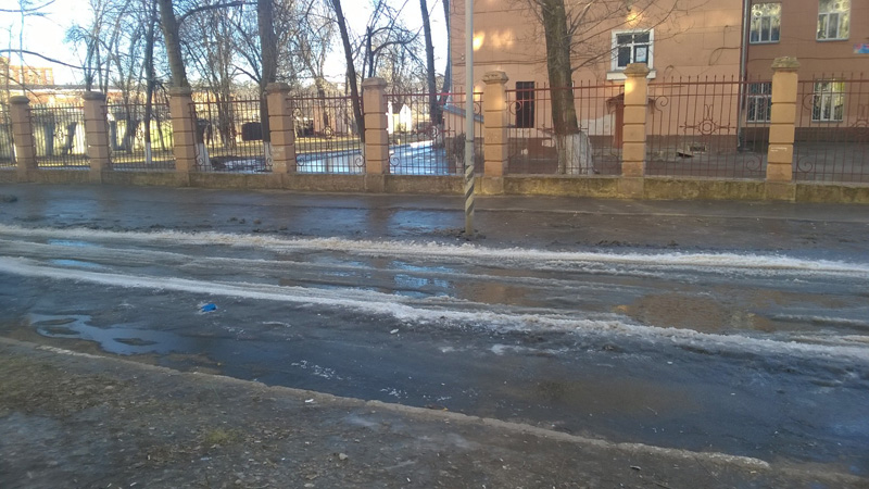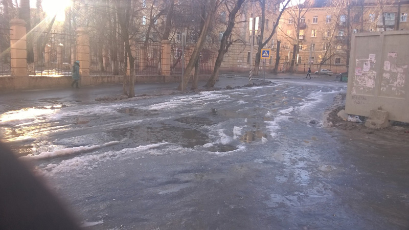 Стекающая по улице Ламповой вода скапливается на улице Осенней, также делая ее труднопроездной. О необходимости очистки от наледи проезжей части у расположенной здесь школы №75 сигнализировала в «Дорожный контроль» местная жительница Ирина.
