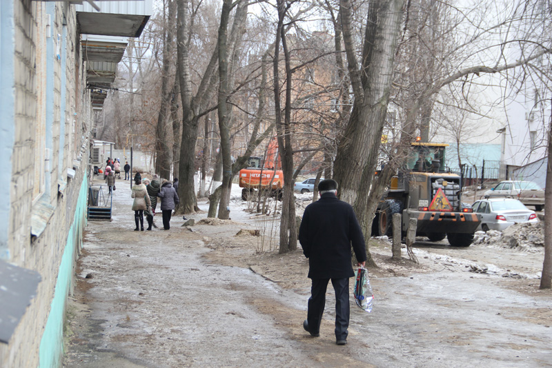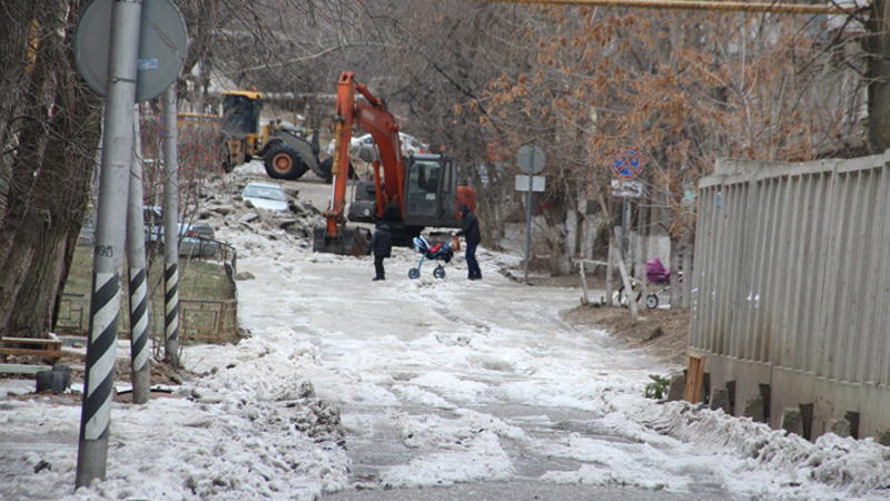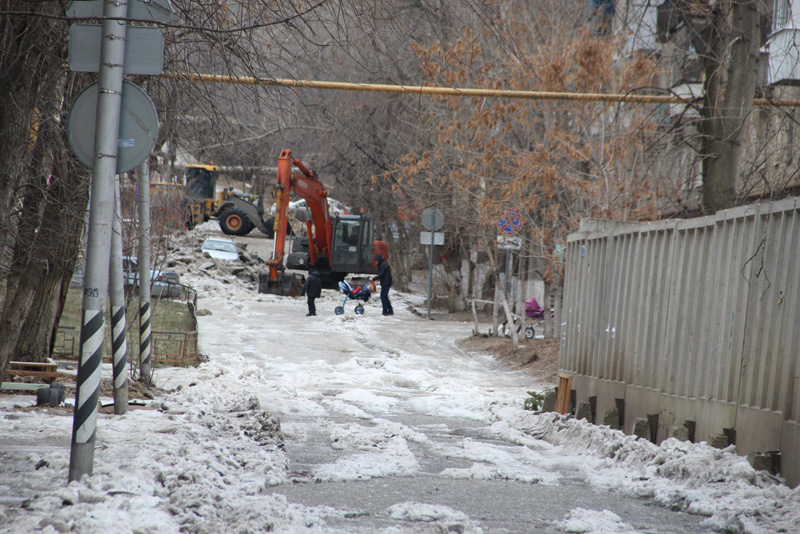 Чтобы подъехать к располагающейся здесь детской поликлинике №5, водители вынуждены были использовать тротуары и зеленую зону. На данный момент идут активные работы по освобождению дороги от многосантиметрового слоя льда, для этого пришлось использовать тяжелую технику.