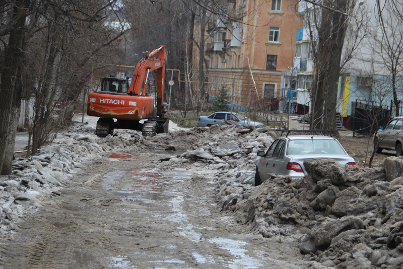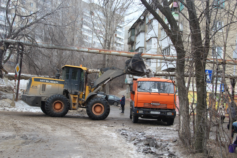 Тяжелой техникой расчищают дорогу к детской поликлиннике