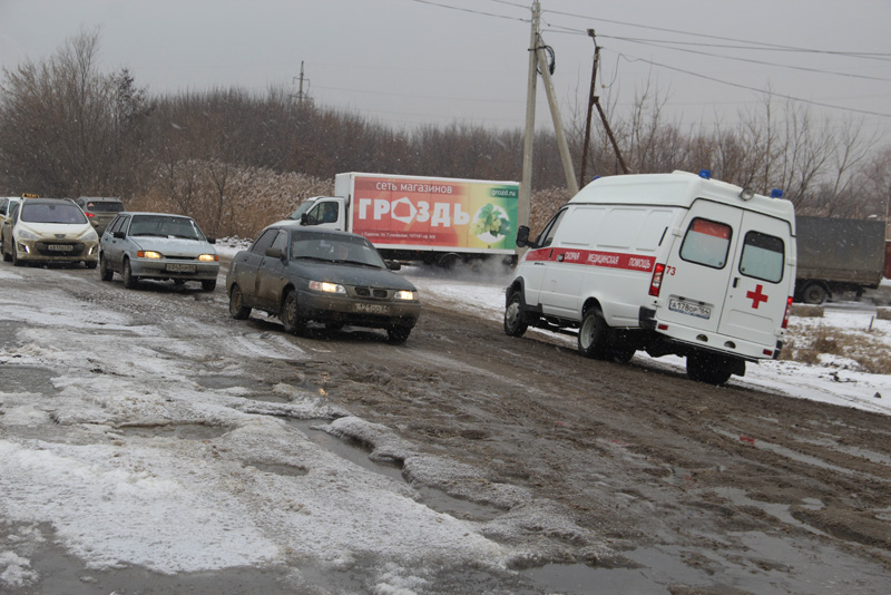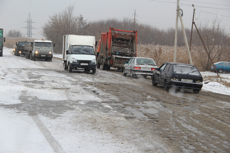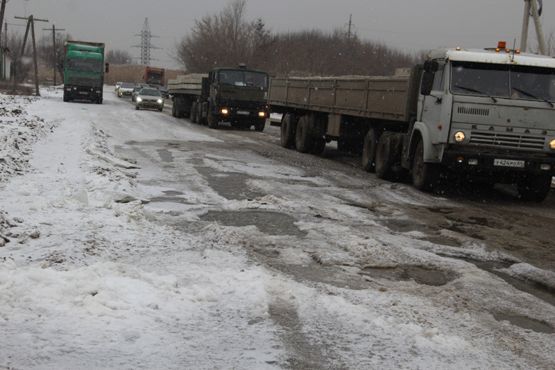 Участок Сокурского тракта на выезде из Ленинского района Саратова покрылся толстым слоем льда, что значительно затрудняет движение транспортных средств. Даже тяжелые грузовые автомобили, которыми изобилует эта дорога, не могут разбить образовавшуюся наледь. Машины, двигающиеся из города, используют для проезда обочину, встречный же поток вынужден ехать по ледяным колдобинам.