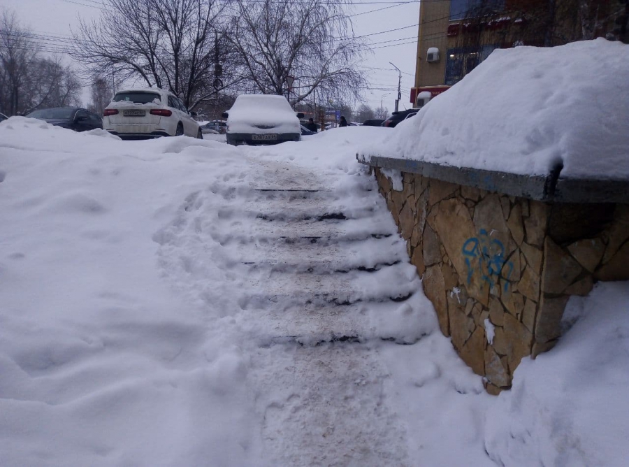 Тротуары также расчищены лишь местами, но многочисленные пешеходы уже хорошо утрамбовали дорожки сквозь сугробы, по которым вынуждены передвигаться. Также от наледи расчищены далеко не все лестницы, некоторые из них превратились в горки, опасные для использования.