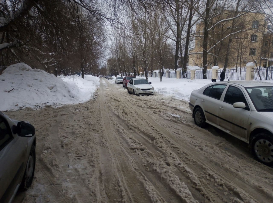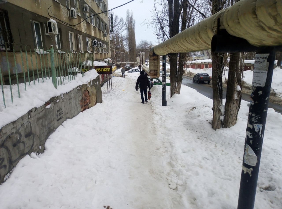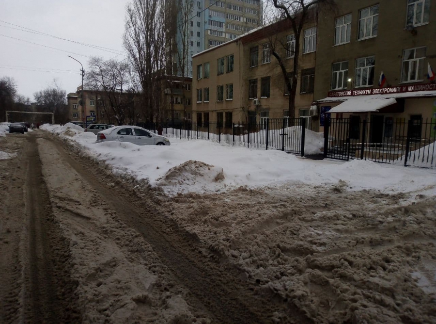 Не расчищены подъезд по улице Зои Космодемьянской к городской поликлинике №9 и Саратовскому техникуму электроники и машиностроения. 1-й проезд Панфилова показательно убрали лишь наполовину, оставив снежные завалы вдоль школы №100, особенно впечатляют горы снега у пешеходного перехода, за которыми не только ребенка, но и взрослого человека не разглядеть, пока он не окажется непосредственно на дороге.