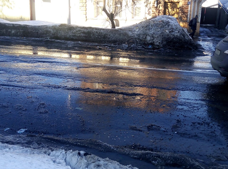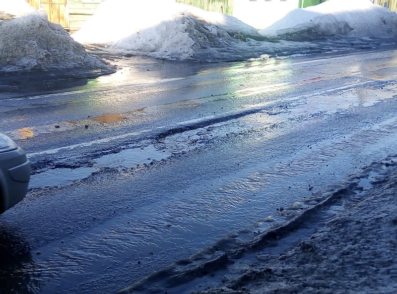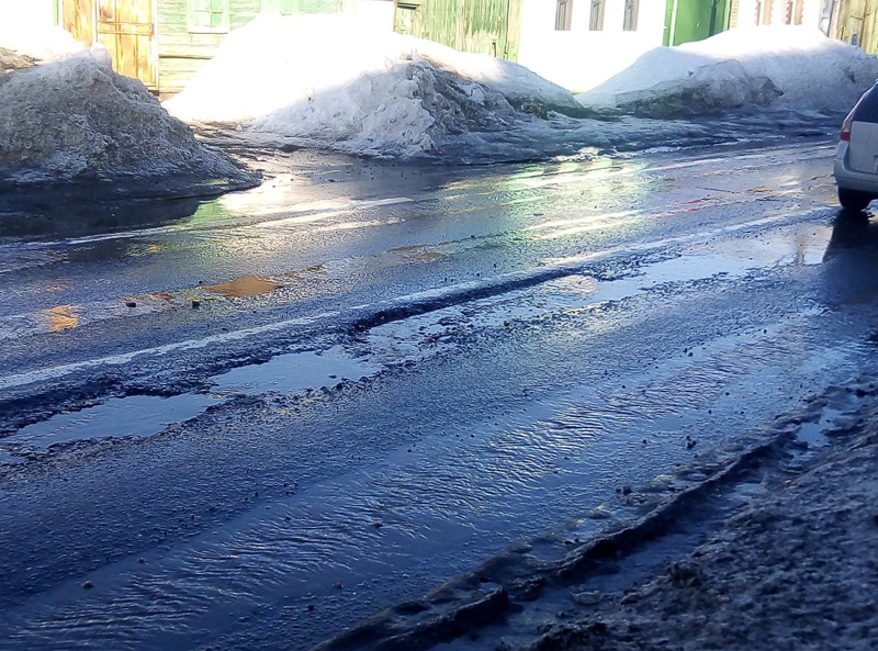На улице Большой Горной дорожная колея превращается в глубокие канавы.