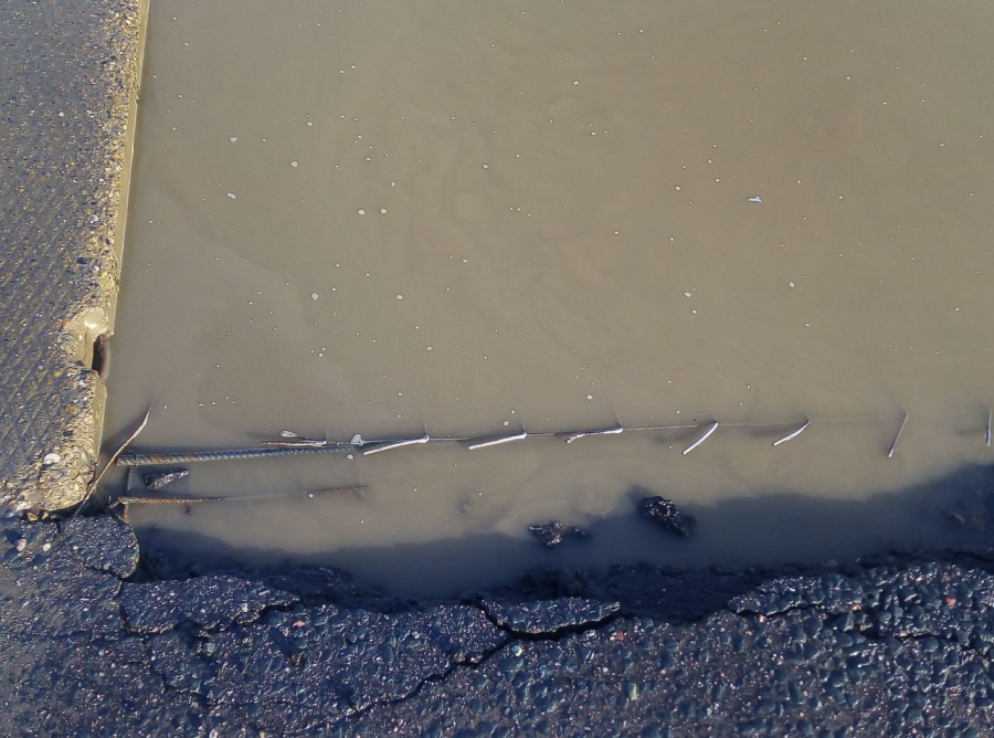 Из плит в основании дороги торчит арматура, угрожая безопасности проезда. Наиболее опасные участки покрыты водой, и оценить угрозу водители не всегда могут верно.