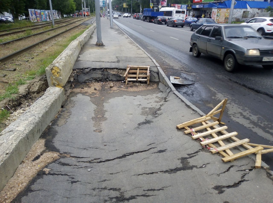 На тротуаре, который отремонтировали в прошлом году по проспекту 50 лет Октября от 1-й Дачной до улицы Технической, образовался провал.