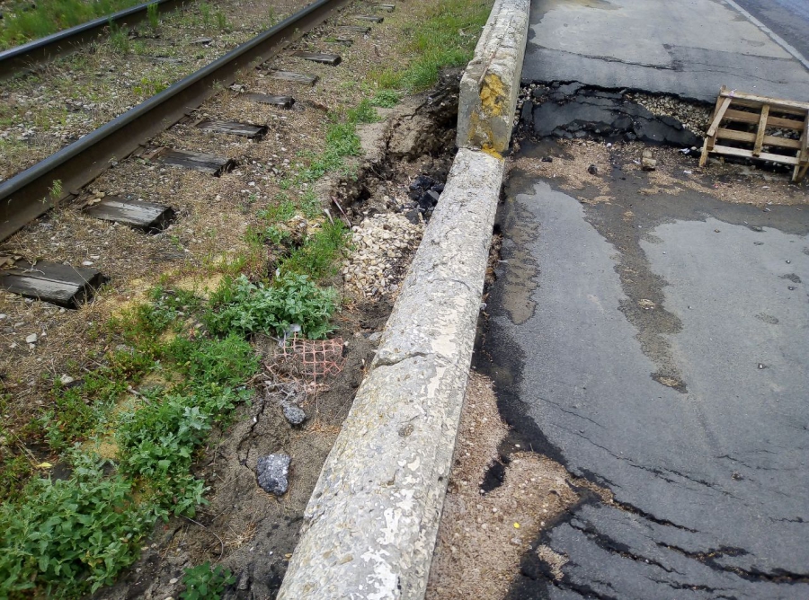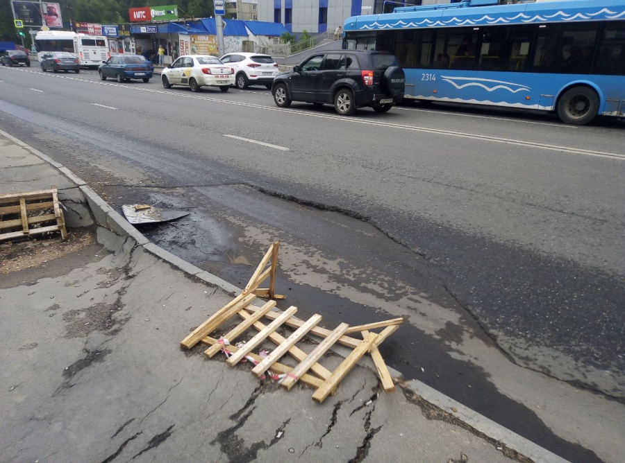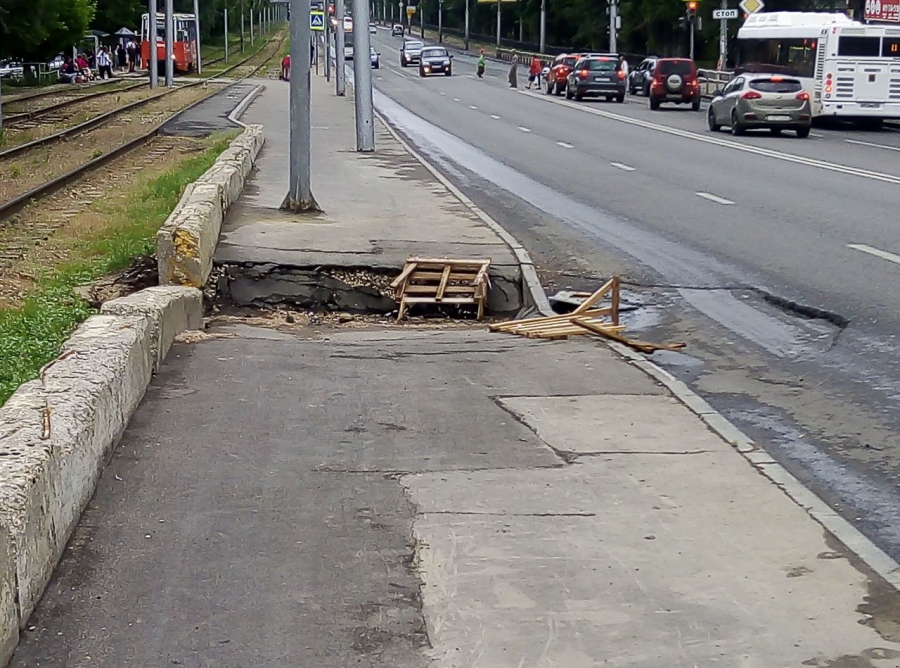 Яма полностью исключила возможность использования пешеходной зоны, а также спровоцировала образование просадки на прилегающем участке проезжей части, что в свою очередь приводит к образованию заторов.
