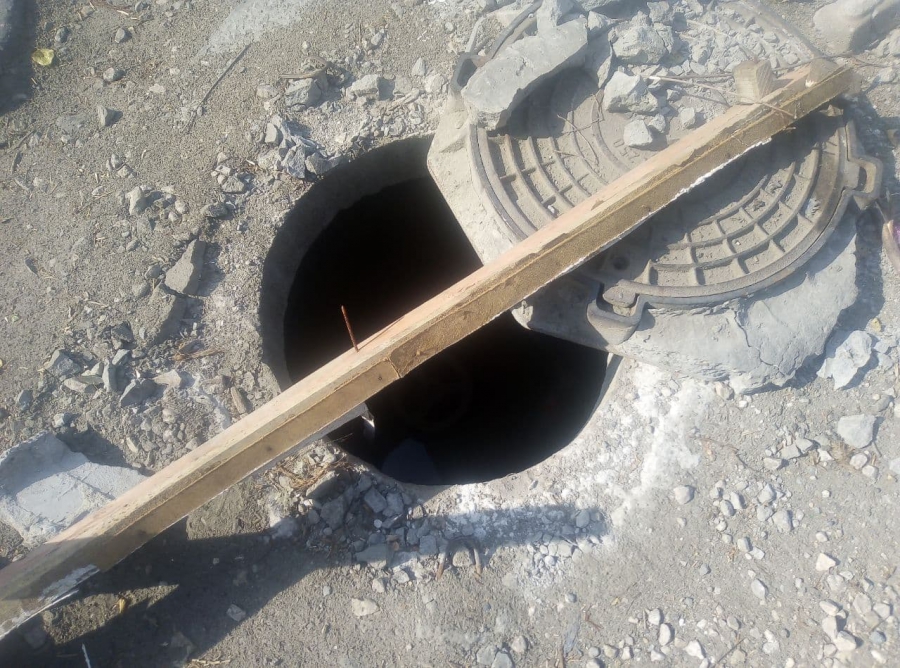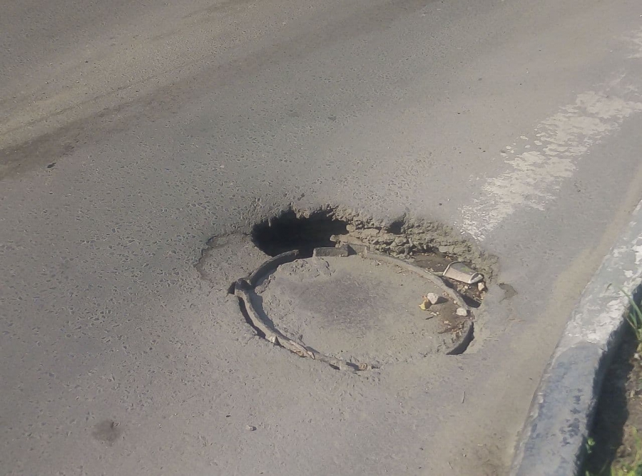 Рядом с разрушенным смотровым колодцем находится значительно просевший люк, который также грозит в скором времени обрушиться.