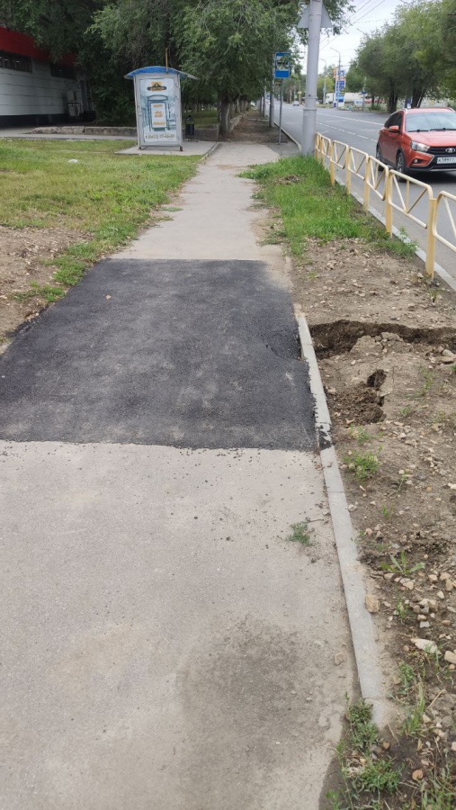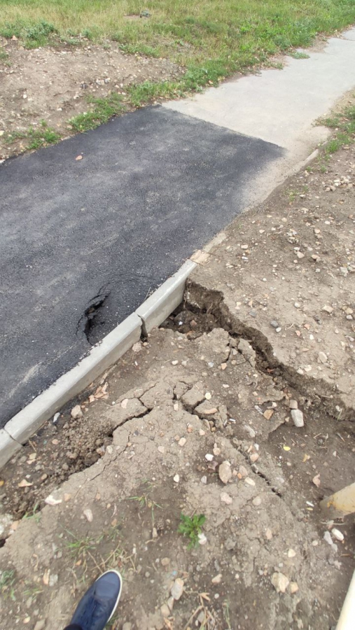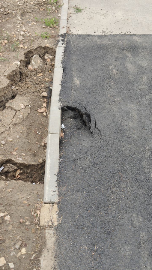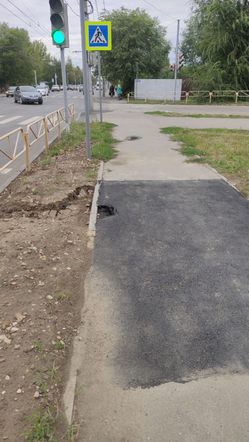 На этом участке тротуара недавно восстанавливали покрытие после вскрышных работ, но выполнены они были с ненадлежащим качеством. Просевшее основание привело к образованию ямы, а бортовой камень местами висит в воздухе.