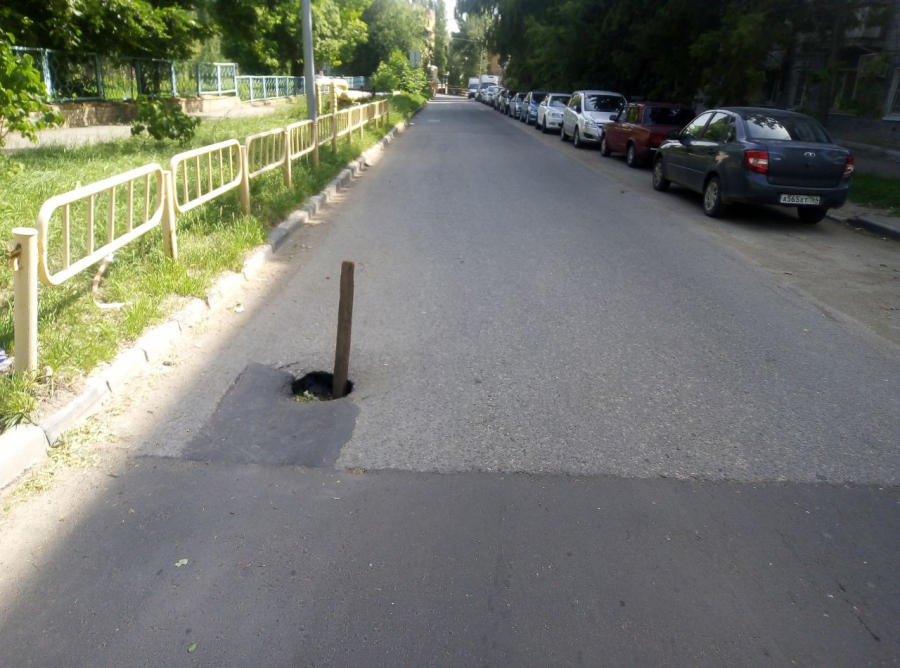Яму обозначили торчащей палкой, но, на сколько сильно разрушено основание дороги и безопасно ли пользоваться этой улицей, остается только предполагать.