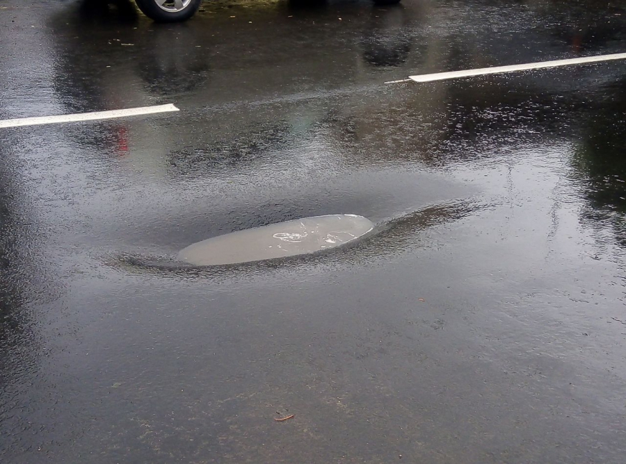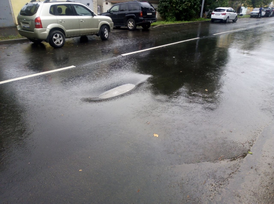 На улице Мичурина, рядом с пересечением с Бабушкиным Взвозом, по центру проезжей части образовалась глубокая просадка.