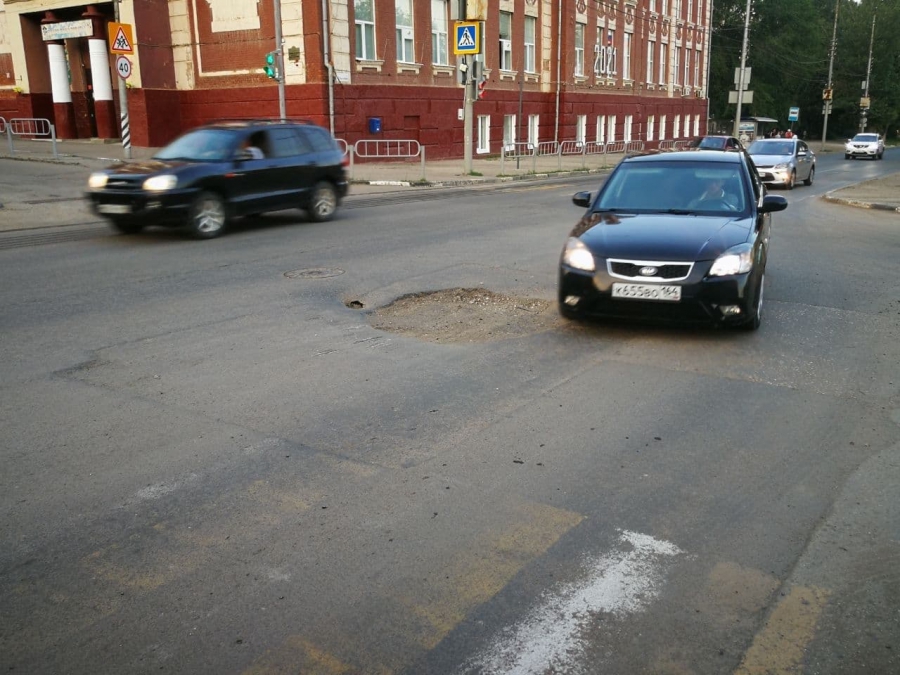 Препятствие находится по центру проезжей части, заставляя водителей активно маневрировать на этой загруженной магистрали. Не успевшие объехать яму автолюбители рискуют повредить свои транспортные средства, о чем свидетельствуют многочисленные следы на асфальте от ударов днищем автомобиля.