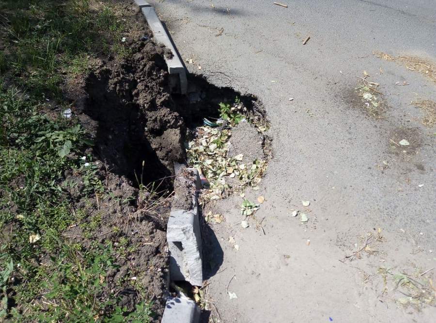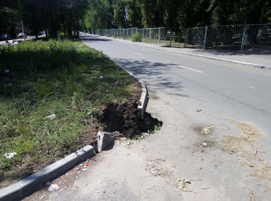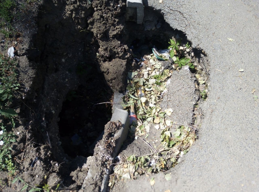 На улице Заречной, рядом с городской клинической больницей №10, образовался провал. Яма появилась с краю проезжей части и уходит глубоко в основание дороги.