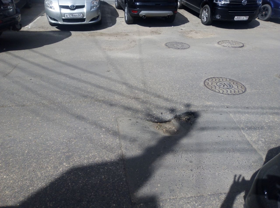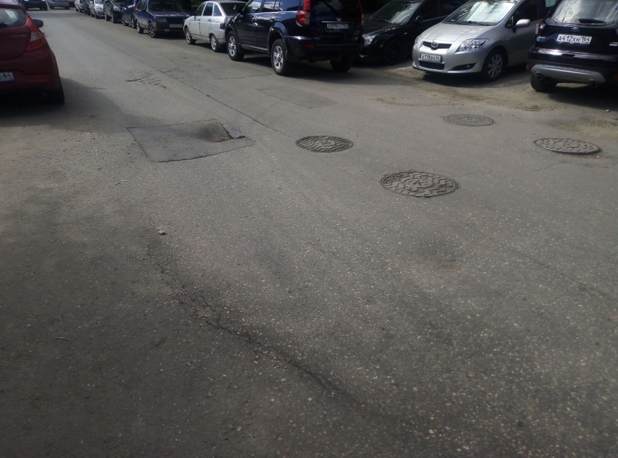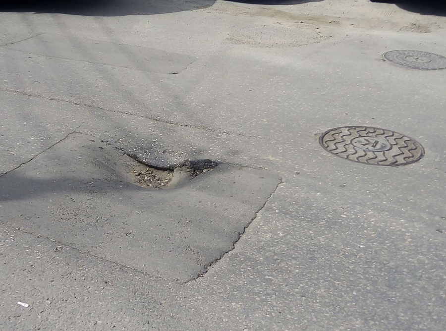 Разрушения появились на просевшем участке дорожного покрытия, соседствующего с многочисленными люками. На узкой, заставленной автотранспортом дороге, водители вынуждены передвигаться в один ряд, и объехать неожиданное препятствие не представляется возможным.