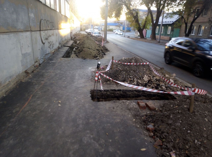 На участке улицы Университетской, от Белоглинской до Рабочей, на тротуаре ведутся активные вскрышные работы.