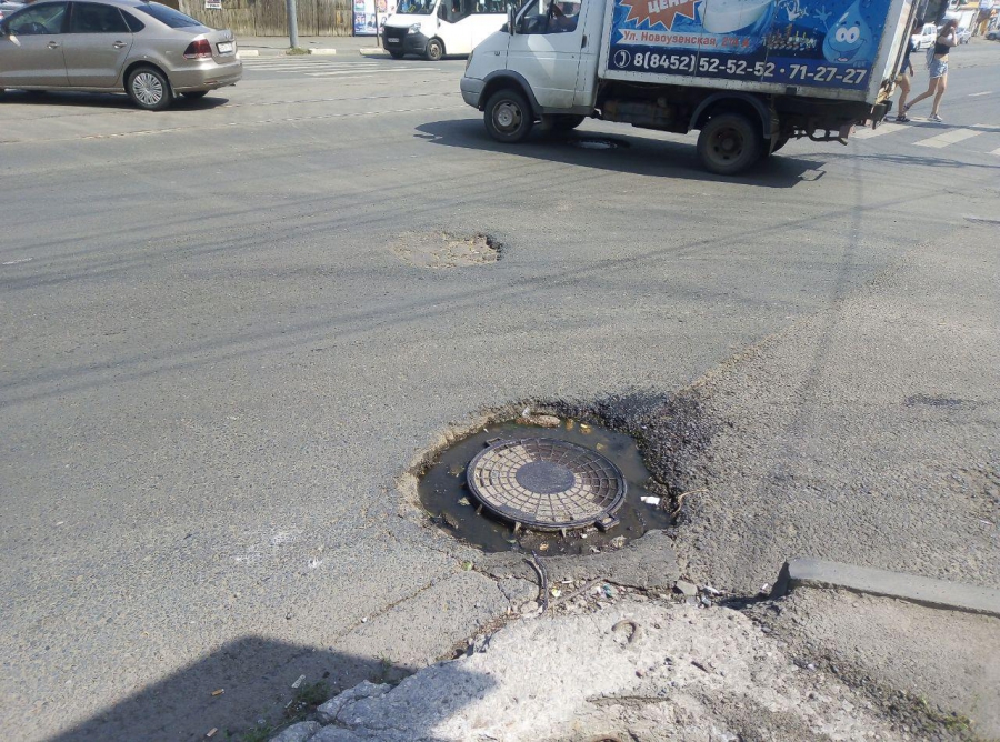 Еще во время весенней инспекции дорог Саратова «Дорожный контроль» обращал внимание на просевшие люки на этом перекрестке. И если за прошедшие время одни люки привели в нормативное состояние, то соседние колодцы, наоборот, просели.