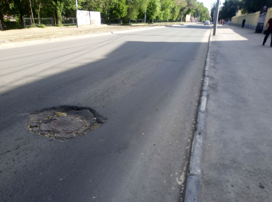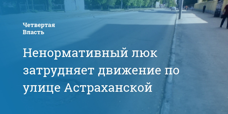На улице Астраханской, после пересечения с улицей Кутякова, расположился смотровой колодец, значительно отклонившийся от уровня покрытия проезжей части.