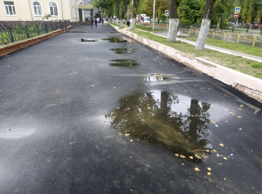 Также добавим, что при ремонте тротуара на улице Жуковского на ровных участках пешеходной зоны подрядчику не удалось организовать водоотведение. Рядом со школой №24 стоят глубокие лужи, занимающие половину ширины нового тротуара.