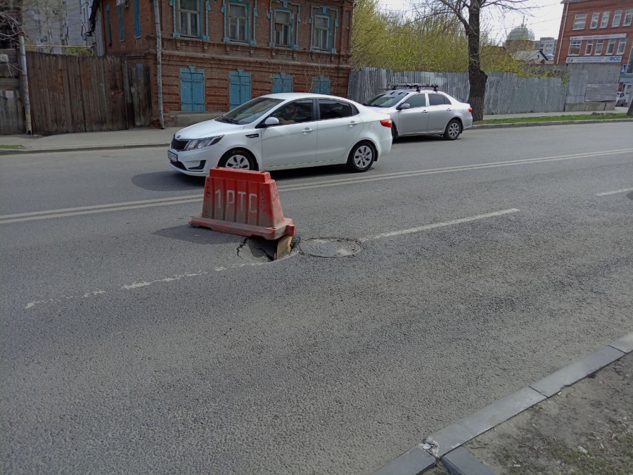После публикации «Дорожного контроля» опасный провал на Чапаева, рядом с пересечением с Зарубина обозначили водоналивным блоком.