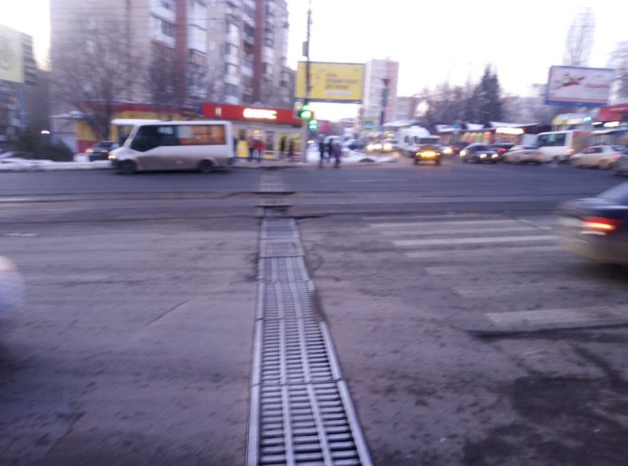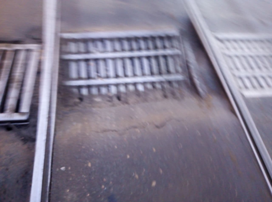 На улице Танкистов, рядом с пересечением с Навашина, проваливается дождеприемник на полосе движения трамваев.